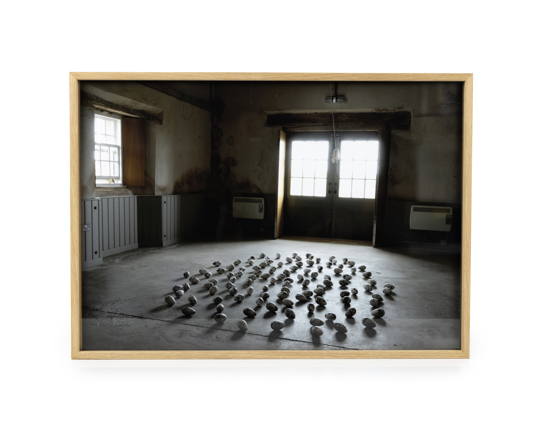 August, 2022 Kelp Store, Papa Westray, Orkney Dr Milo NewmanJesmonite resin, photographic emulsion. The framed photographs depict an artwork, Colony. Produced and exhibited on the island of Papa Westray in Orkney, this installation responds to the local extinction of the great auk. Though not the last of these birds in existence, a pair of great auks was killed here in 1812 and 1813. Known locally as the “King and Queen of the Aaks”, they were the last to be seen in Orkney, with only a few later accounts marking the species’ continued existence elsewhere around the North Atlantic. The male bird was killed on behalf of the collector William Bullock, who desired a specimen of the bird for his museum. The taxidermy mount is now held in the Natural History Museum.